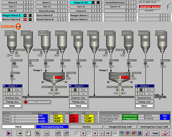For smaller plants we use the WinCC visualization package or the Protool package for small plants to carry out cost reduction. In the area of the batch mixture we use controllers of the series SIWAREX U or M in connection with S7 400 controller and decentralized ET200 periphery with Profibus or Ethernet interface. In the melting area, the ET200 modules are also used together with the S7 400 and S7 300 controllers. For an exact controlling of the combustion air we take frequency converters of the series Micromaster with Profibus interface. The plunger control system is realized with the Simatic S7 317 T CPU. On the machines and handing over units Simodrive or Sinumerik drive components are used. Different OP´s (operation panel) and TP´s (touch panel) are used as display and operator unit directly at the machinery. By using a decentralized construction with ET200 modules in connection with OSM (optical switch module), OLM (optical link module) and optical fibre the reduction of the wiring effort is substantially, which leads to an enormous reduction of costs by installation, maintenance and operation of the plant. A high availability of the plant is guaranteed by means of remote diagnosis and remote project engineering. Also the maintenance effort and the fault diagnosis time will be reduced to a minimum.